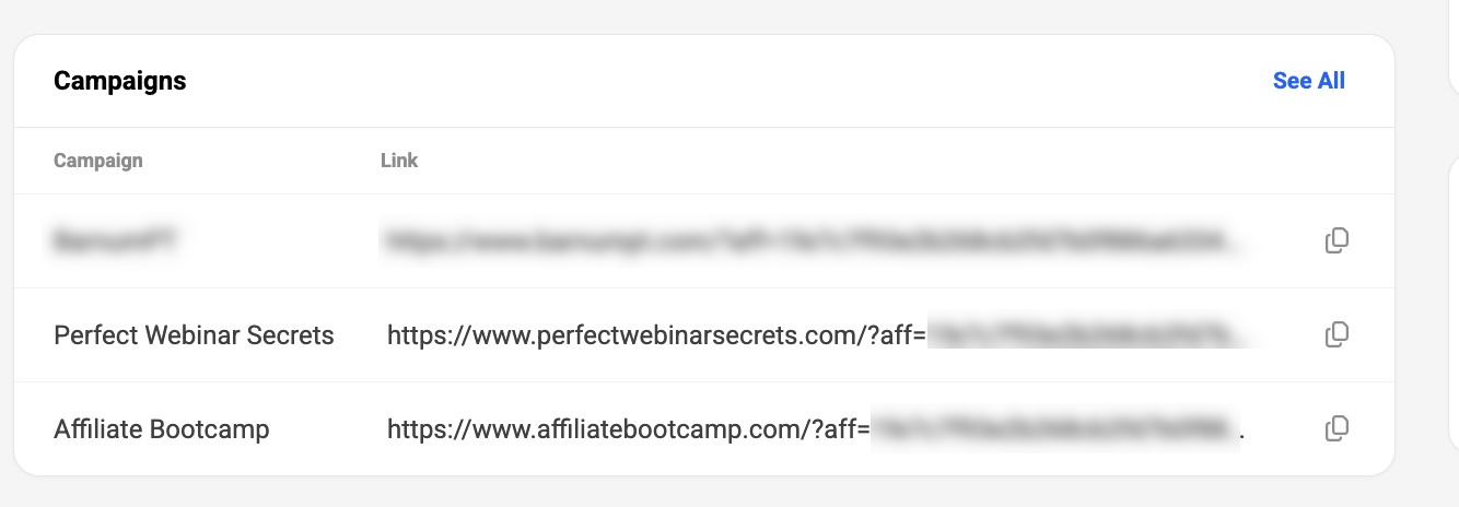- Shows the campaign name and associated affiliate link.