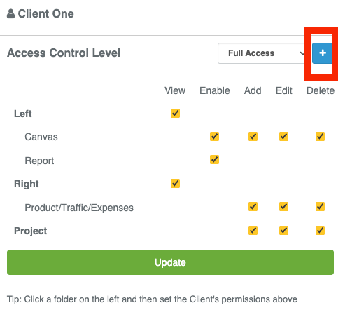 - Leave the Access drop-down at current access, check and uncheck the boxes to set permissions. And click update.