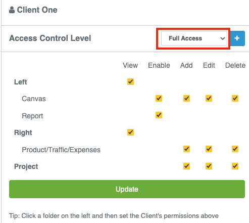- From the drop-down menu, select full access, limited, or read-only. You can still customize the default preset by checking and unchecking boxes. And, click update.