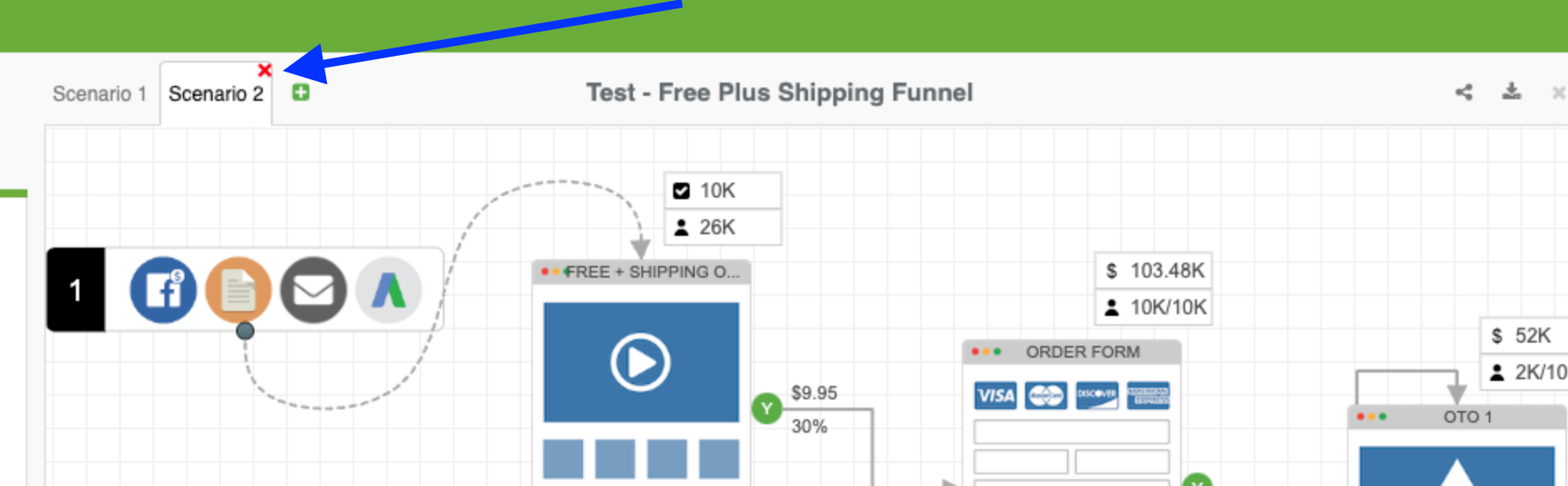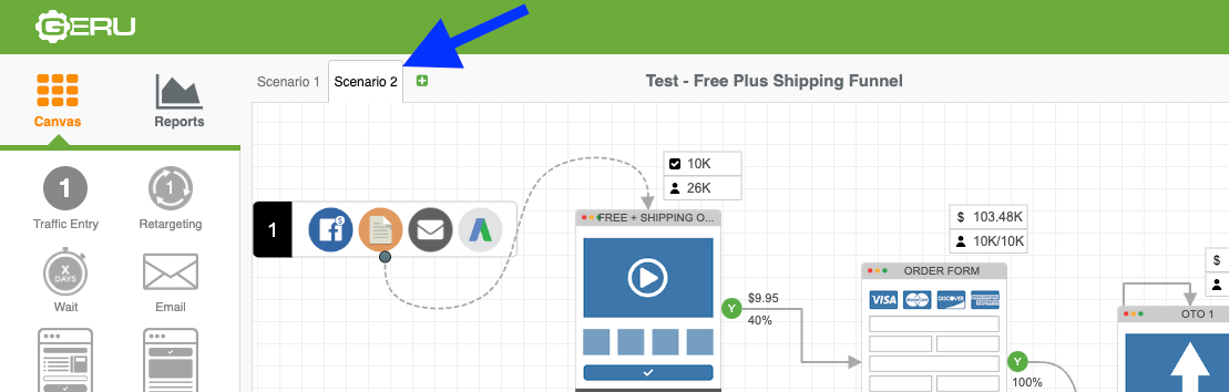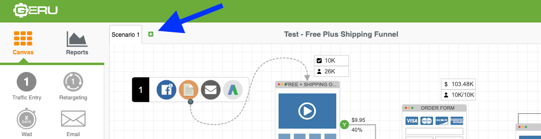 Once you have completed your funnel map in the first tab, you can test out other scenarios without needing to re-add all the objects to test out a new scenario. You can simply duplicate the canvas and then make changes to the duplicate to create a new simulation/test.