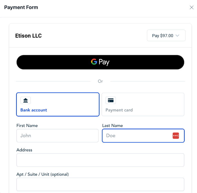 - A payment form will open where you can pay the invoice with your current card or add a new credit card.