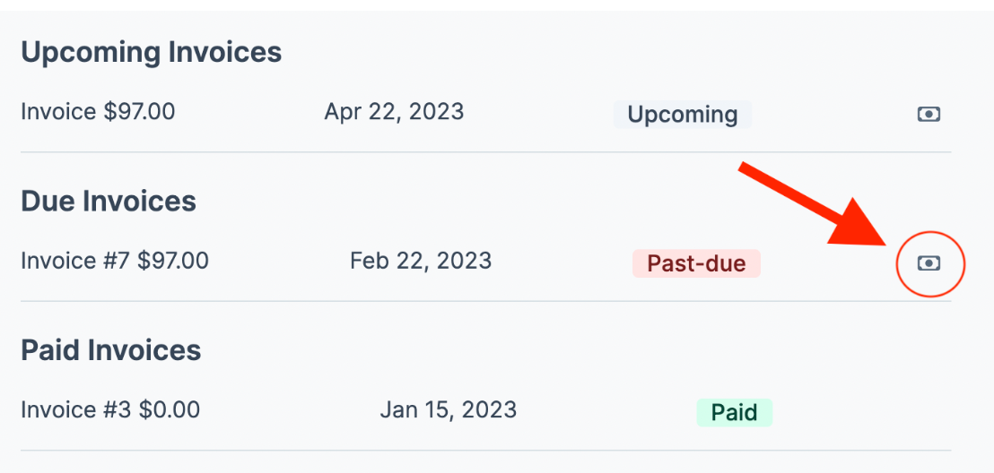 - Under due invoices section, click on the pay icon to pay the invoice.
