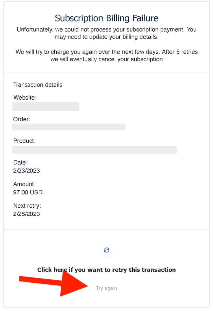 The email will come from noreply@payments.ai and will include the payment amount owned. You can make a payment from the email by clicking on try again on the bottom as in the image below.