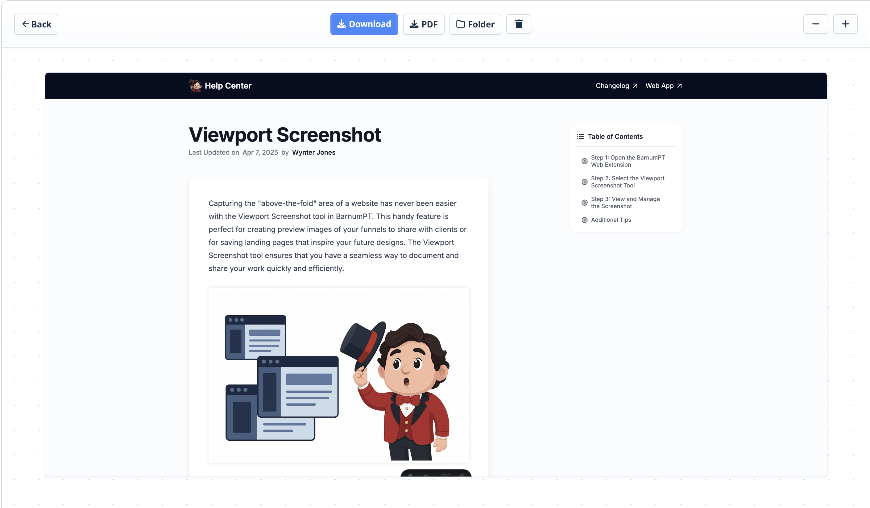 The Viewport Screenshot tool is a powerful feature within BarnumPT, designed to streamline your workflow and enhance your productivity. Whether you're showcasing your own funnels or gathering inspiration from others, this tool ensures you capture and manage your visual materials effortlessly.
